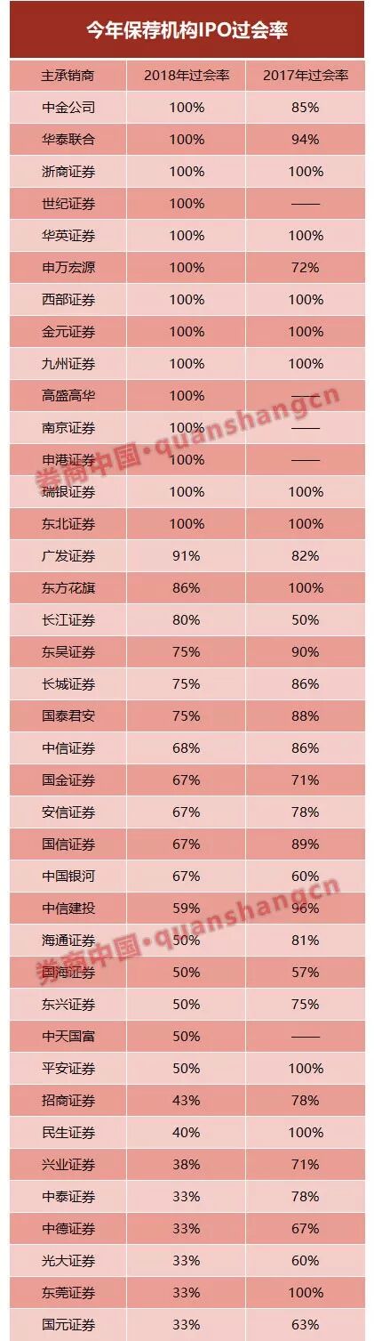 今年有14家保荐机构IPO过会率达100%,其中中金公司和华泰联合证券分别上会的7家企业全部过会;去年这两家保荐机构的首发过会率分别为85%和94%,不过去年过会企业数量比今年多,中金公司去年有11家企业过会,华泰联合证券有17家企业过会。