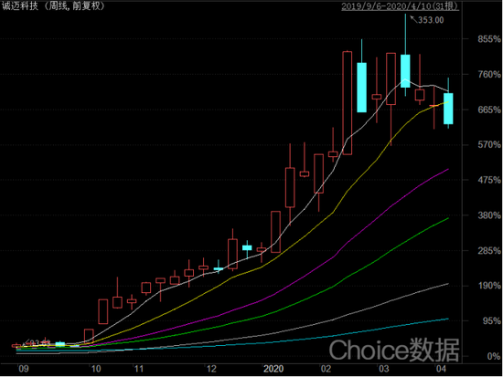 抱紧华为大腿的妖股诚迈科技(SZ:300598)就是其中一个:从2019年9月开始,诚迈科技股价从34元涨到350元,市值最高达282亿人民币。